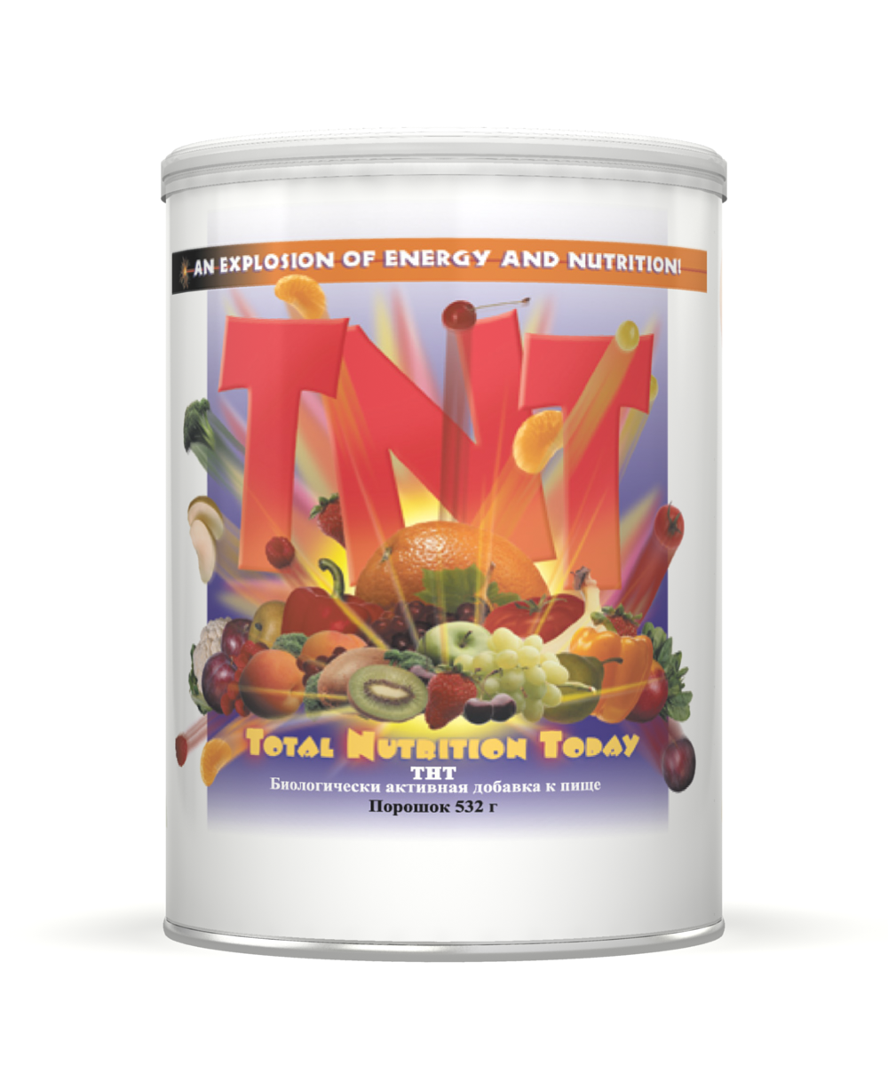 ТNТ (Total Nutrition Today – Полноценное питание сегодня) – напиток, обогащенный необходимыми для организма 12 витаминами, 12 биоэлементами, содержит в-каротин и лецитин, а также смесь пищевых растительных волокон: гуммиарабик, рисовая мука, целлюлоза, каррагенан, клетчатка сои, овса, свеклы, гороха, яблока, овсяные и кукурузные отруби, гуаровая камедь в количестве 6,5 г (в том числе 4,5 г растворимых и 2 г – нерастворимых). ТНТ также содержит углеводы в виде фруктозы, и мальтодекстрина. Калорийность – около 70 ккал на порцию 19 г.